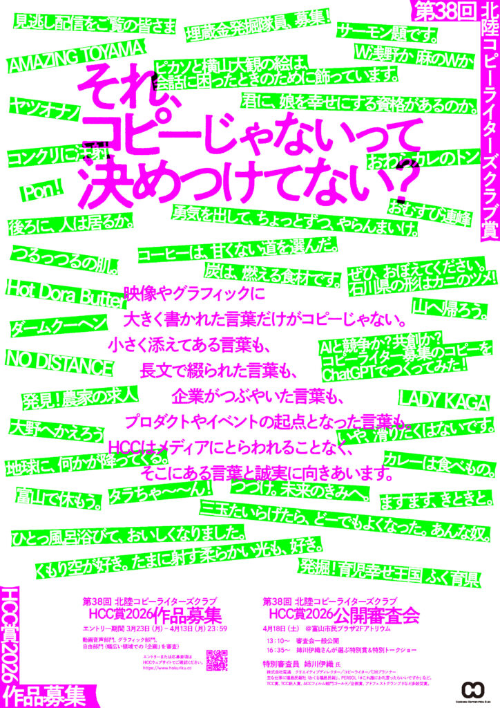 HCC(北陸コピーライターズクラブ)は北陸の優れた広告やコピーを讃え、HCC賞を贈っています。 2026年4月18日(土)に特別審査員姉川伊織氏を迎えて行われる第38回HCC賞審査会への応募作品を3月23日(月)からエントリー開始します。